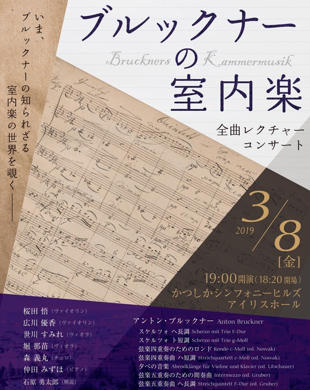 第1回目は2019年3月8日に「ブルックナーの室内楽 全曲レクチャーコンサート」と題し、世界初演となる作品2曲を含む、ブルックナーの弦楽器を用いた室内楽作品を一晩で取り上げました。