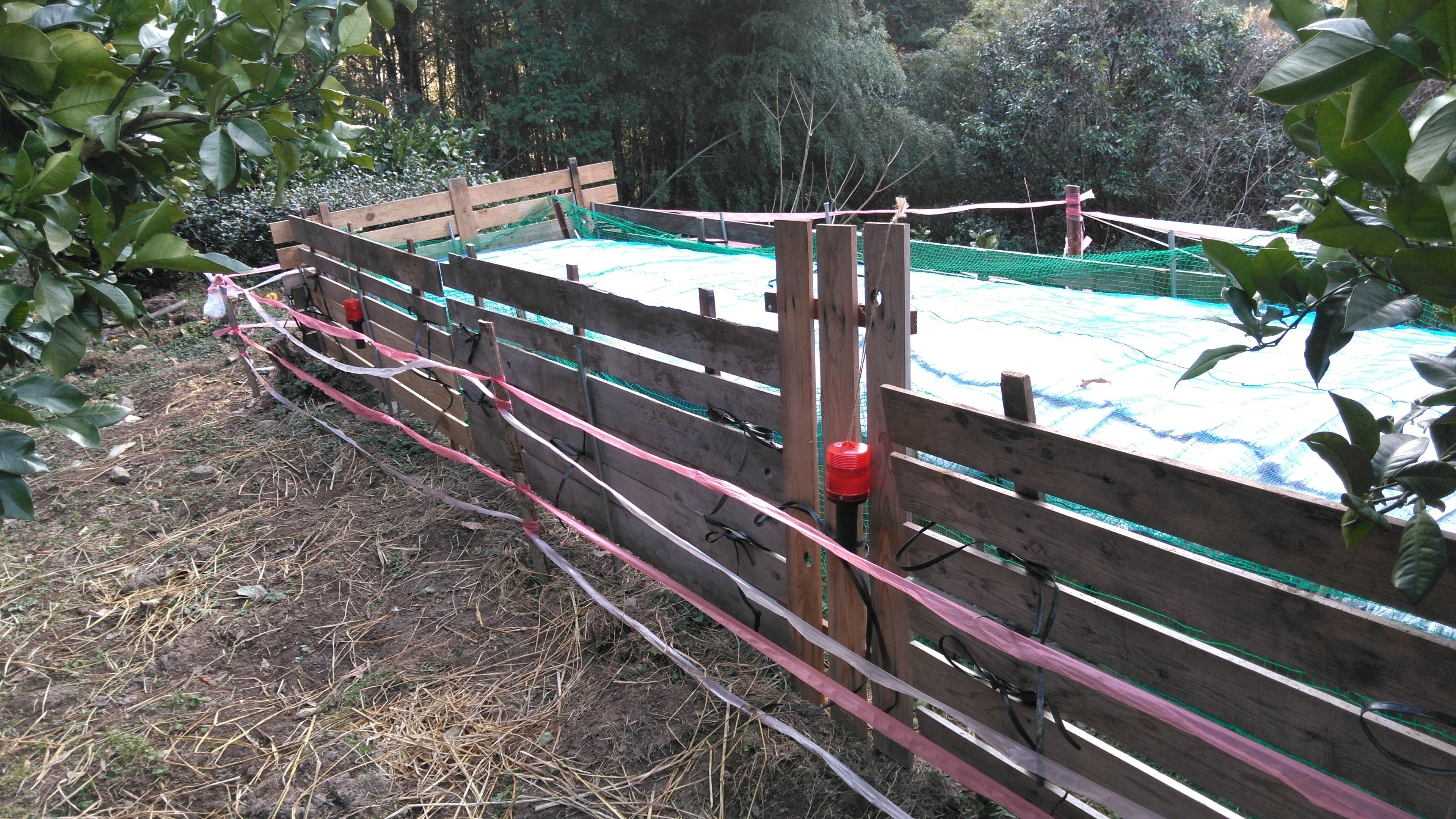 写真.イノシシによる食害が発生している地域での野囲い貯蔵のようす(周りに高い柵や網が設置されています)