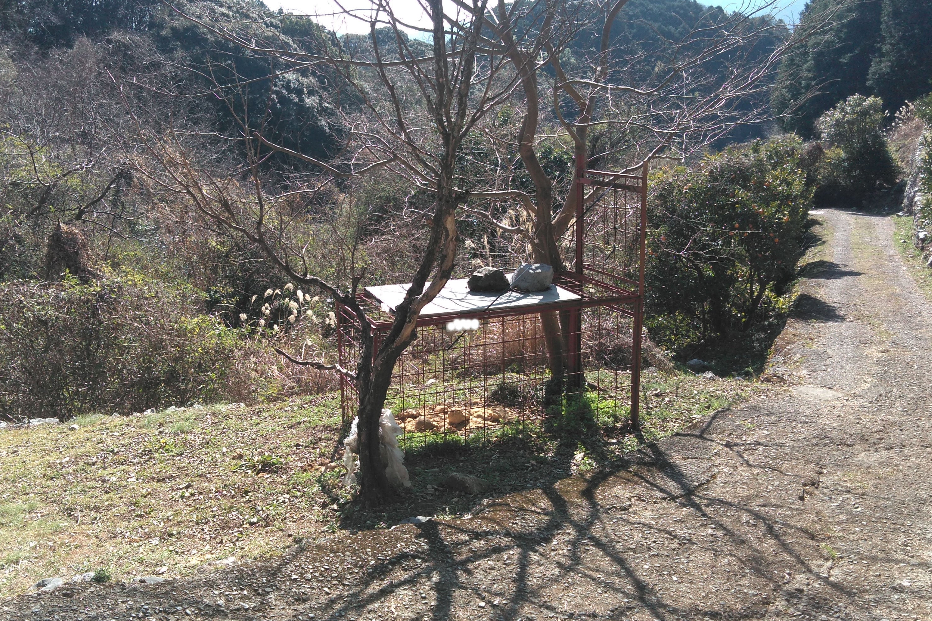 写真.実際に文旦山付近に設置されている箱わな(中にはイノシシをおびき寄せるための米ぬかが入れられています)