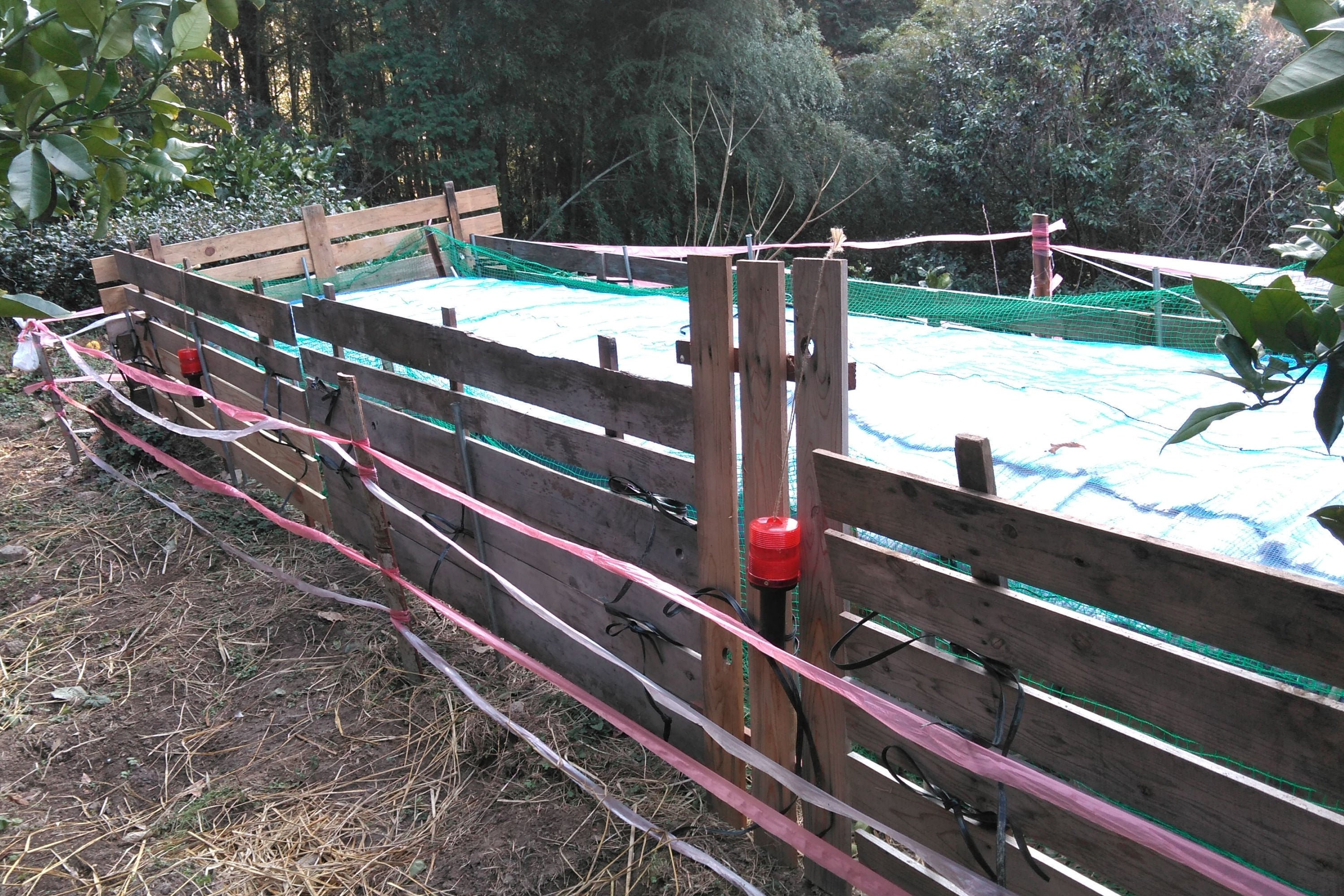 写真.イノシシによる食害が発生している地域での野囲い貯蔵のようす(周りに高い柵や網が設置されています)