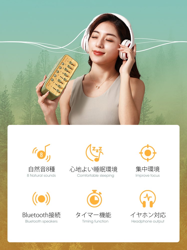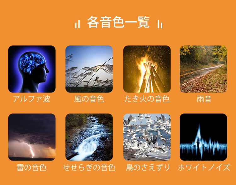 8種類の音はそれぞれ、アルファ波音楽、風音、たき火の音、雨音、雷鳴、せせらぎ、鳥のさえずり、ホワイトノイズとどれも自然由来のものを選んで収録しております。