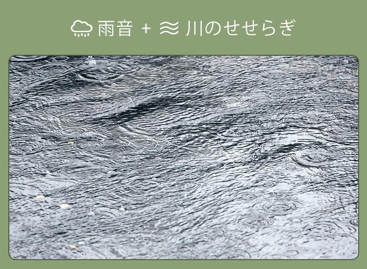 雨音とせせらぎの組み合わせならば、しとしとと降る雨が川面を弾くイメージ。安心感ある水音で、成長期のお子様の眠りをやさしくサポートします。