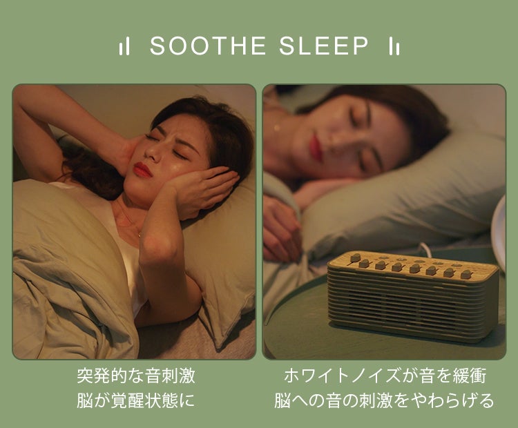 ホワイトノイズには、人の耳で聞き取れる「すべての周波数の音」が含まれています。光の三原色のように、すべて同じ割合で調合すると白くなることになぞらえ、この名前がつきました。このホワイトノイズが、外からの異音やノイズといった音の刺激を「音のカーテン」して緩衝するといわれており、脳への刺激を抑え、安らぎの眠り空間を継続させてくれます。