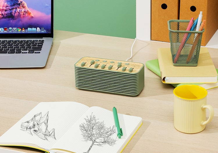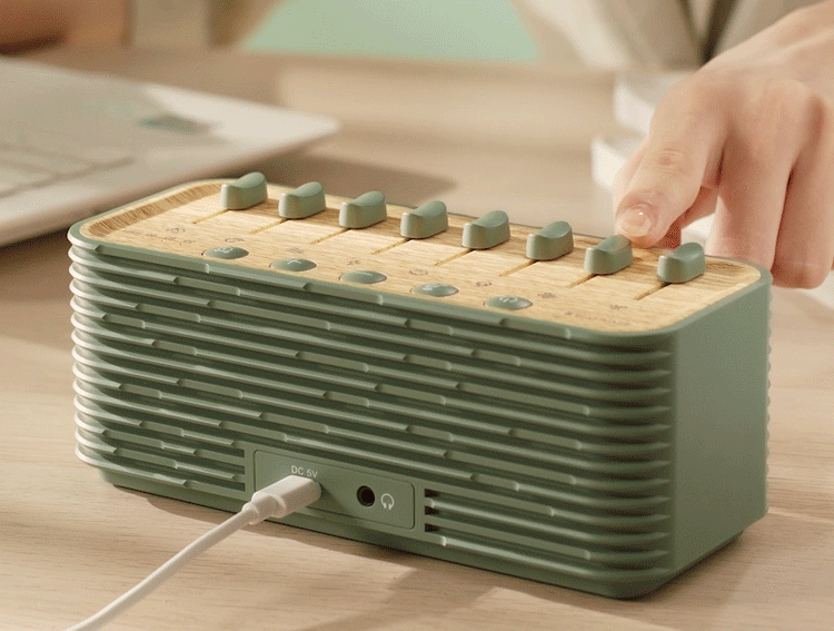 本製品「Aegle」は川のせせらぎや鳥のさえずり、たき火の音など自然が奏でる音色が8種類収録。気持ちの良い睡眠環境を作り出すホワイトノイズや、アルファ波音楽も収録し心地よい音を作り上げました。