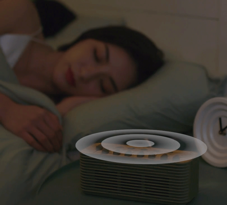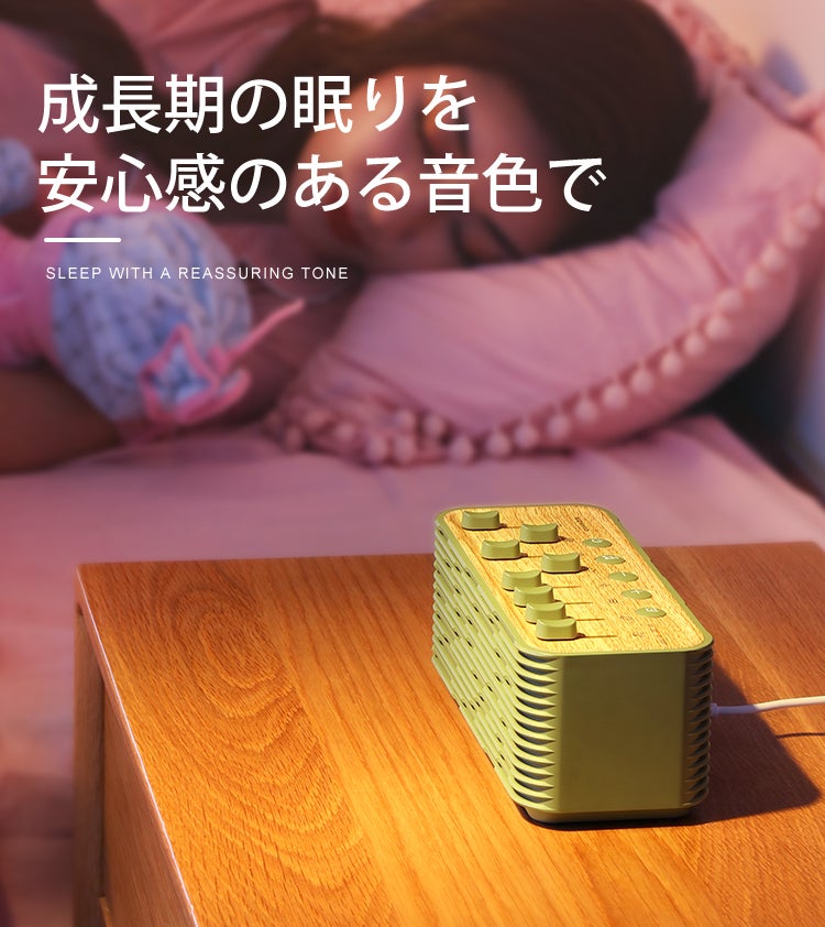 ホワイトノイズには、人の耳で聞き取れる「すべての周波数の音」が含まれています。光の三原色のように、すべて同じ割合で調合すると白くなることになぞらえ、この名前がつきました。このホワイトノイズが、外からの異音やノイズといった音の刺激を「音のカーテン」して緩衝するといわれており、脳への刺激を抑え、安らぎの眠り空間を継続させてくれます。