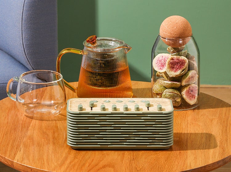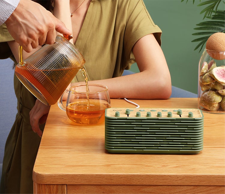 在宅ワーク中のデスクの上で、ティータイムのテーブルの上で、ベッドサイドで。本製品リラクゼーションスピーカー「Aegle」は、安らぎたいあなたのそばで音色を奏でます。