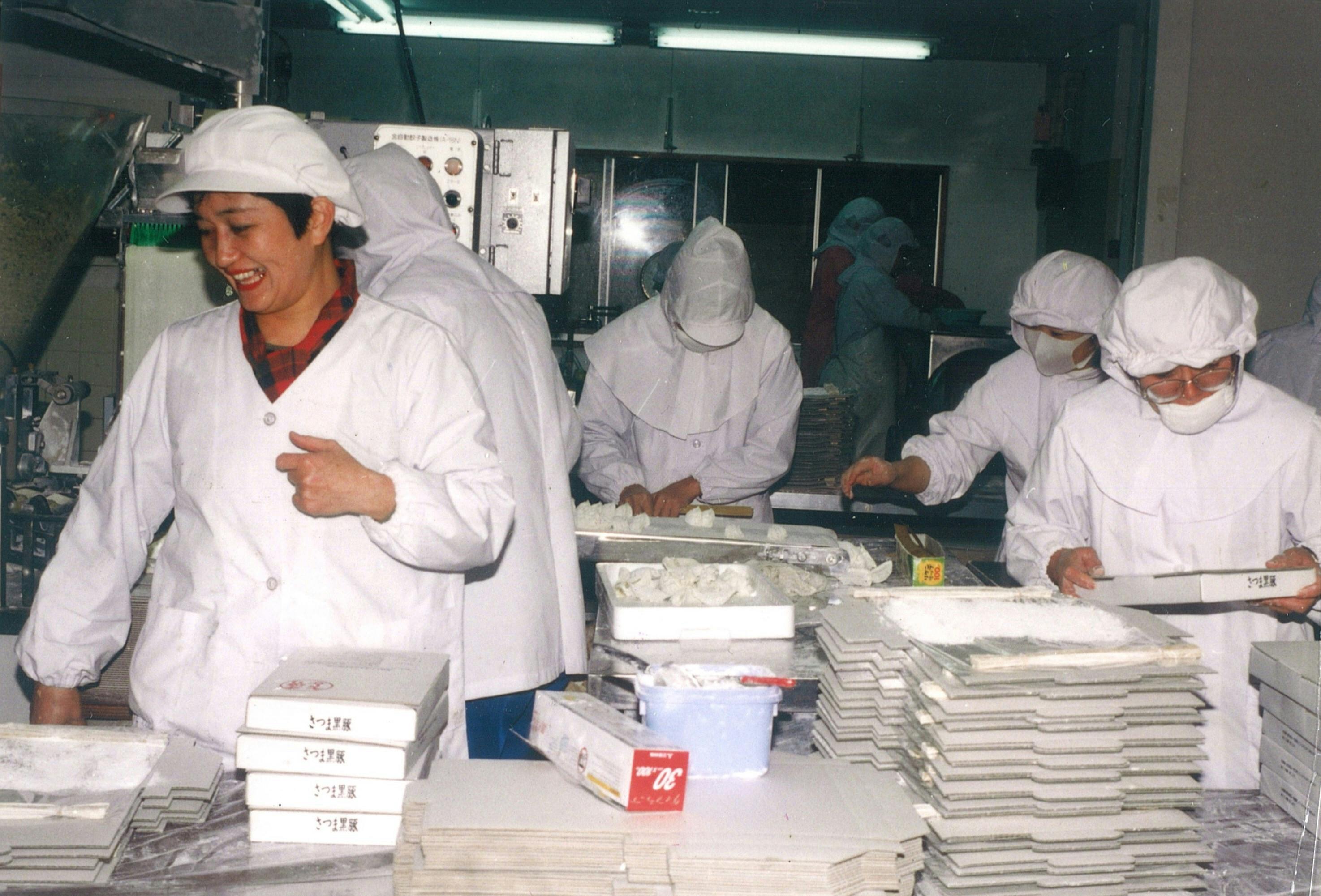 ▲創業後、工場として歩み出した活気ある頃[一番左が母(久子)]