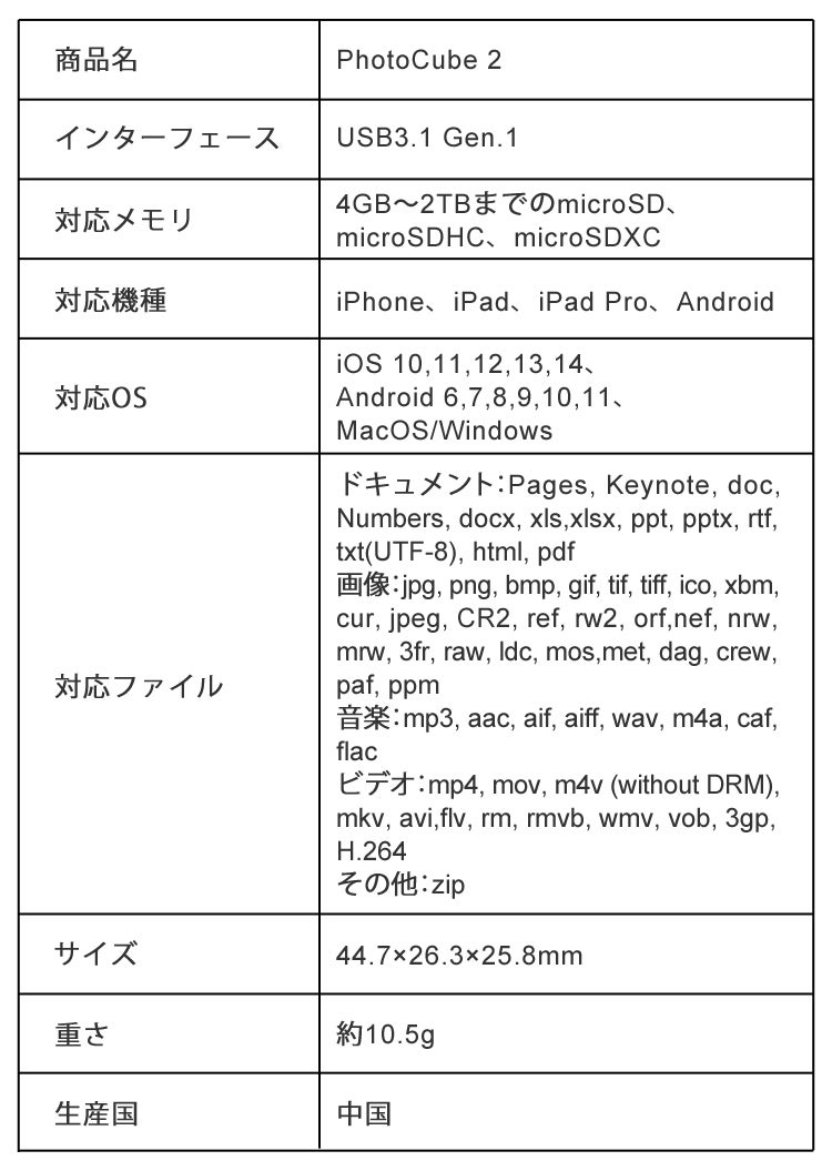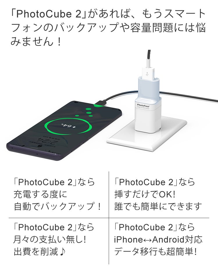 機種変更時のデータ移行に煩わしい思いをしたことはありませんか?データ移行が面倒で機種変更を先延ばしにしたことは?「PhotoCube 2」があれば、その煩わしさから解放!突然の水没や破損で壊れてしまった場合や、紛失してしまった場合もこれなら安心ですよね。