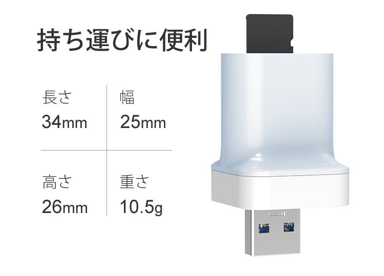 指2本で持つことのできるコンパクトサイズで、重さはわずか約10.5g。持ち運びの負担になることもなく、手軽に外部ストレージを増やすことができます。