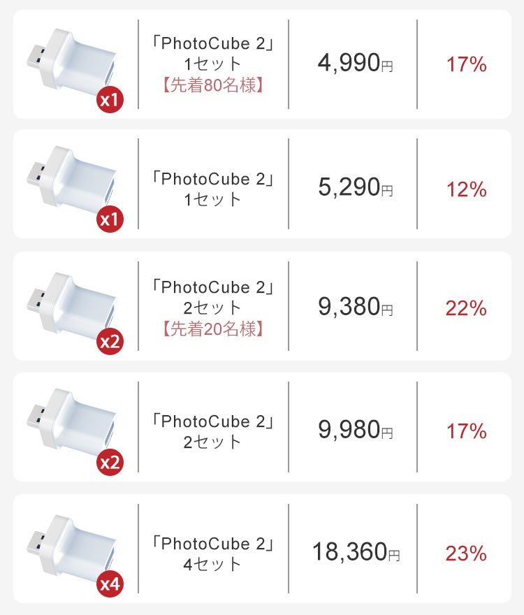 メモリが内蔵式ではなく、外部ドライブを使用する「PhotoCube 2」は容量に制限なし。メモリカードを増やせば増やすだけ容量が拡がります。
