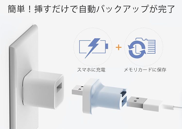 普段使用している充電アダプタとケーブルの間に「PhotoCube 2」を挟むだけで準備は完了。充電と同時進行で、データのバックアップ作業を自動で行います。