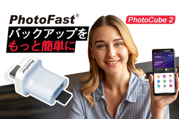 「PhotoCube 2」とは、充電する度にデータを自動でバックアップしてくれる超便利ガジェットアイテム!普段使用している充電アダプタとケーブルのあいだに挿すだけなので、ガジェットが苦手な方でも安心してご使用いただけます。