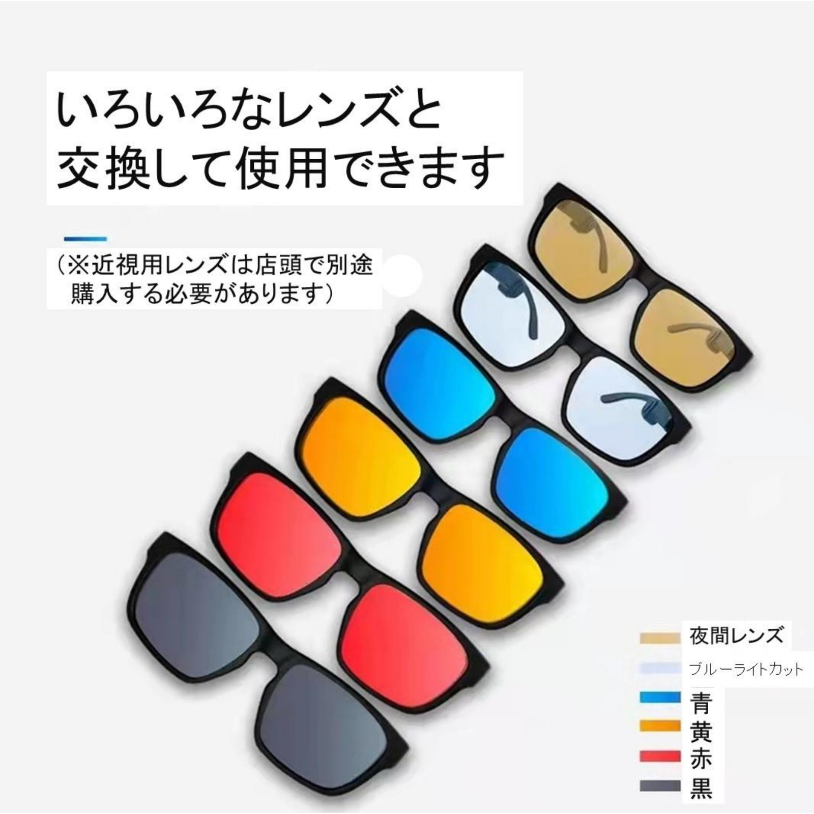 ブルーライトカットレンズ(クリアレンズ)+夜間・黒・赤・青色の計5色がもれなくついてくるCAMPFIRE限定特別セット