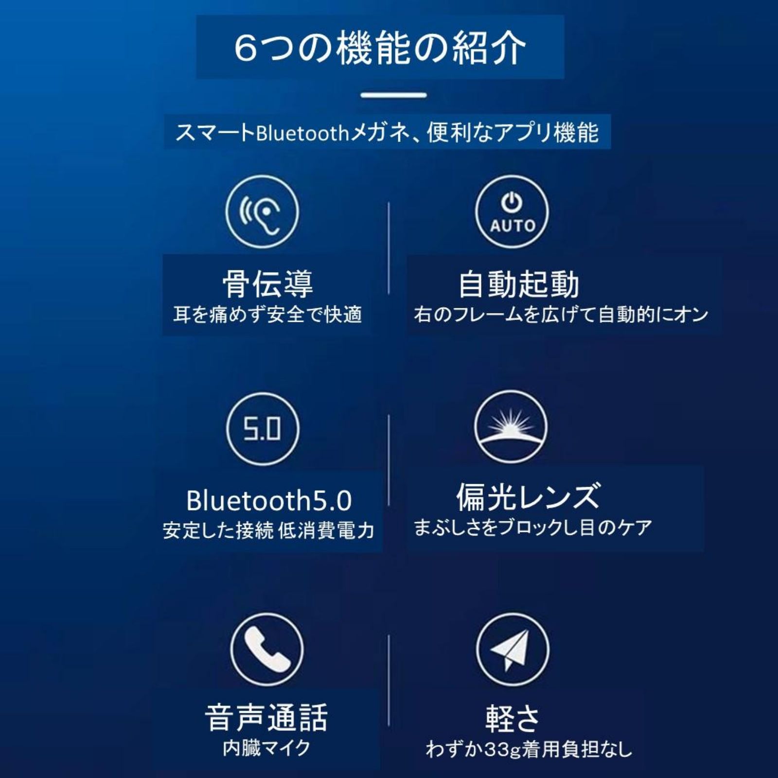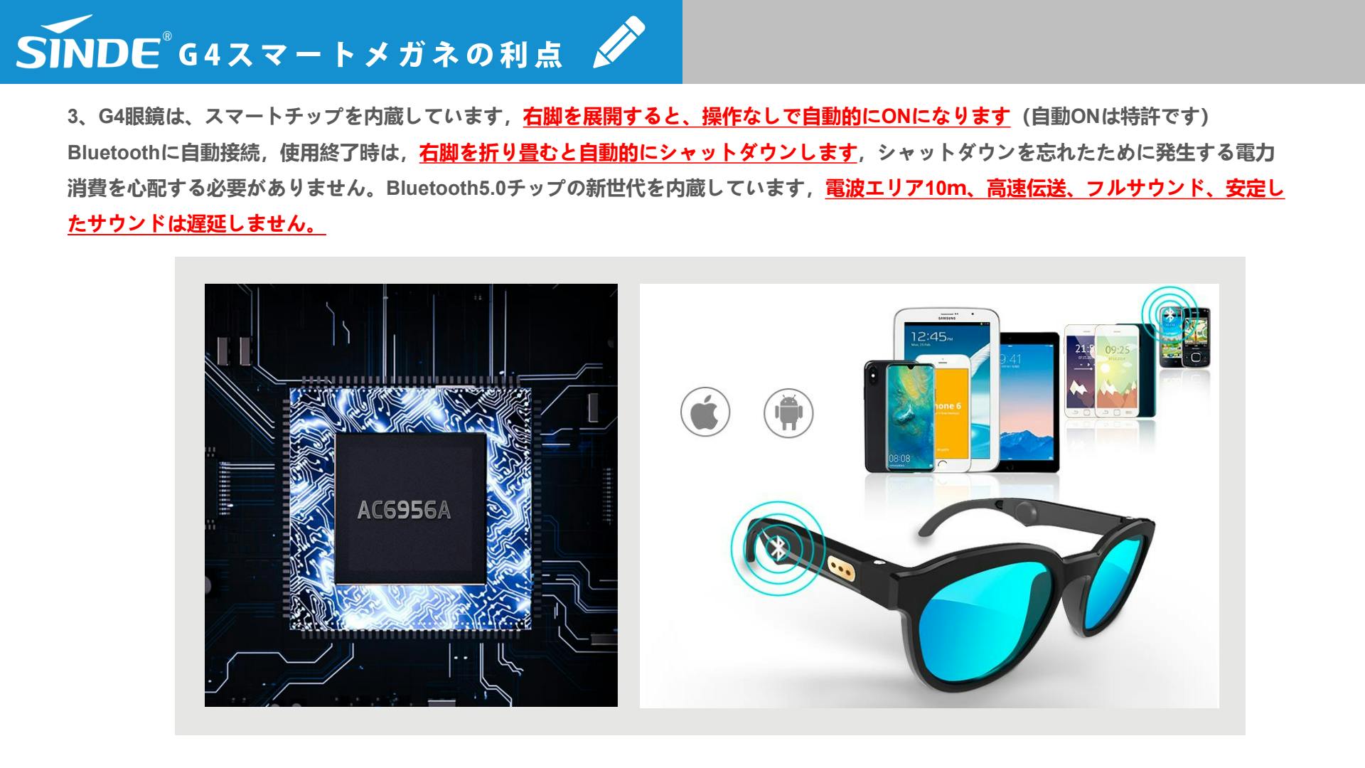 「スマートグラスSD-G4」偏光レンズは、日中の日差しを防ぎ、紫外線を効果的にブロックし、夜間は道路をよりはっきりと、様々な夜の派手な光をブロックすることができます。 昼夜を問わず快適に読書や自動車を運転することができます。