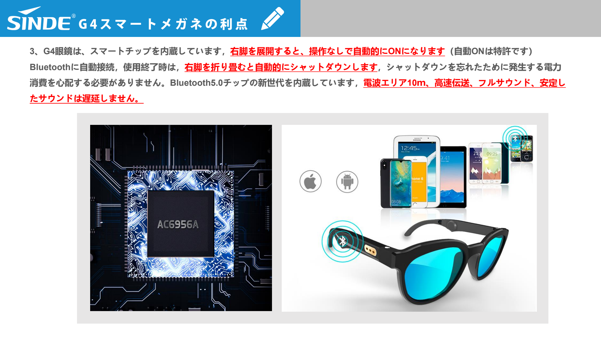 「スマートグラスSD-G4」にはスマートチップが内蔵されており、操作なしで右側