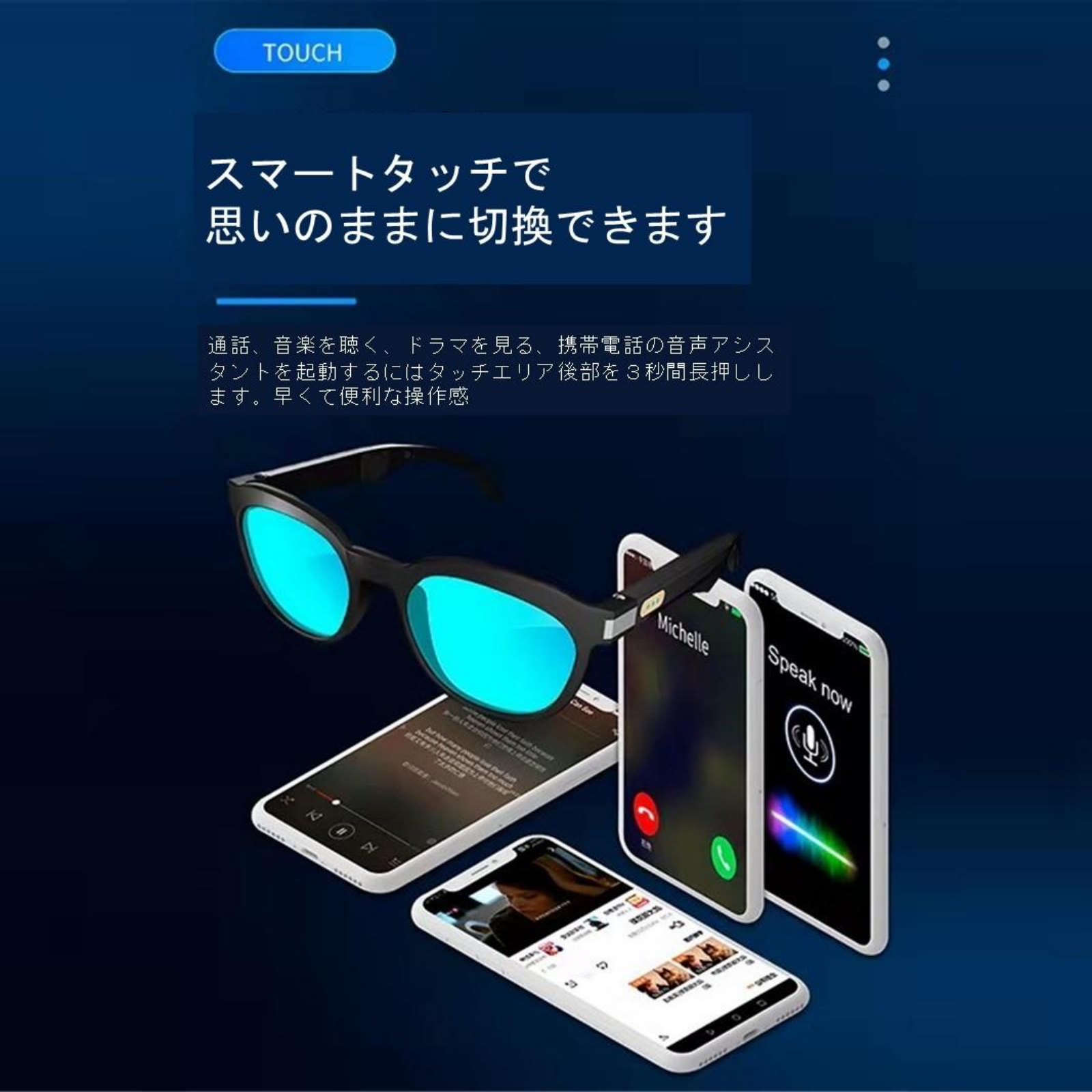 革新的なデザインにより、眼鏡のフレームに電話や音楽をワンタッチで操作できるため、スマートフォンの機能をポケットから取り出さなくても簡単に制御できます。