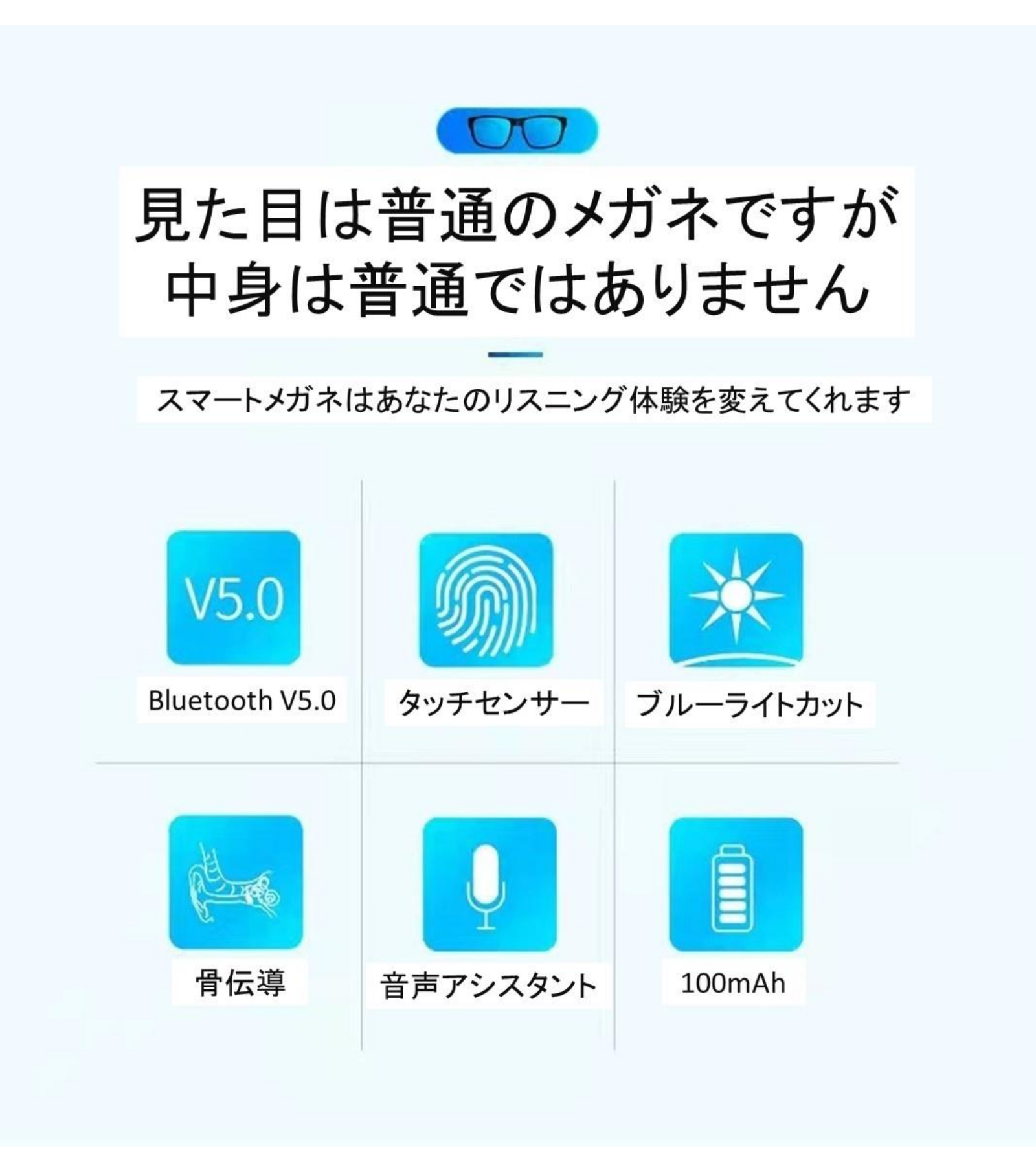 見た目は完全に普通のメガネですが、実はスピーカーとBluetoothが内蔵されており、耳を塞がずに音楽や通話が楽しめます。