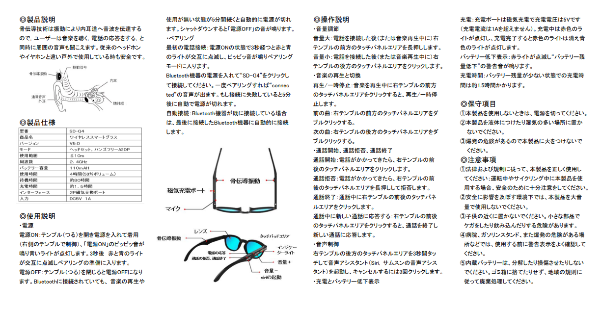 「スマートグラス SD-G4」は、最新の骨伝導スピーカー技術を搭載しております。骨伝導技術というのは音を鼓膜に通さず、小さな振動を作り骨を通じて、音を伝える技術です。鼓膜や外耳道に損傷を与えることなく、そして周囲の目を気にすることもなく、臨場感あふれる豊かなサウンドに没頭できます。