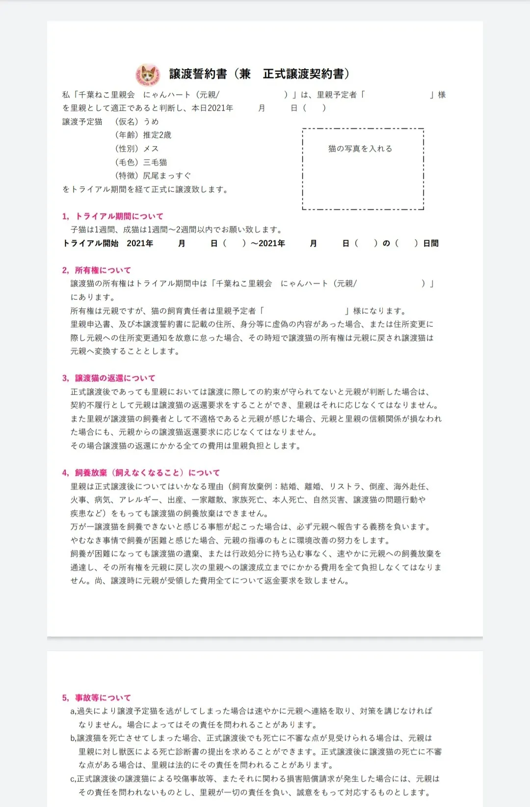 さて、本日はにゃんハートでトライアルが決まった子をお届けの時に必要な譲渡誓約書(兼 正式譲渡契約書)を作ってみましたので、少しお見せします。