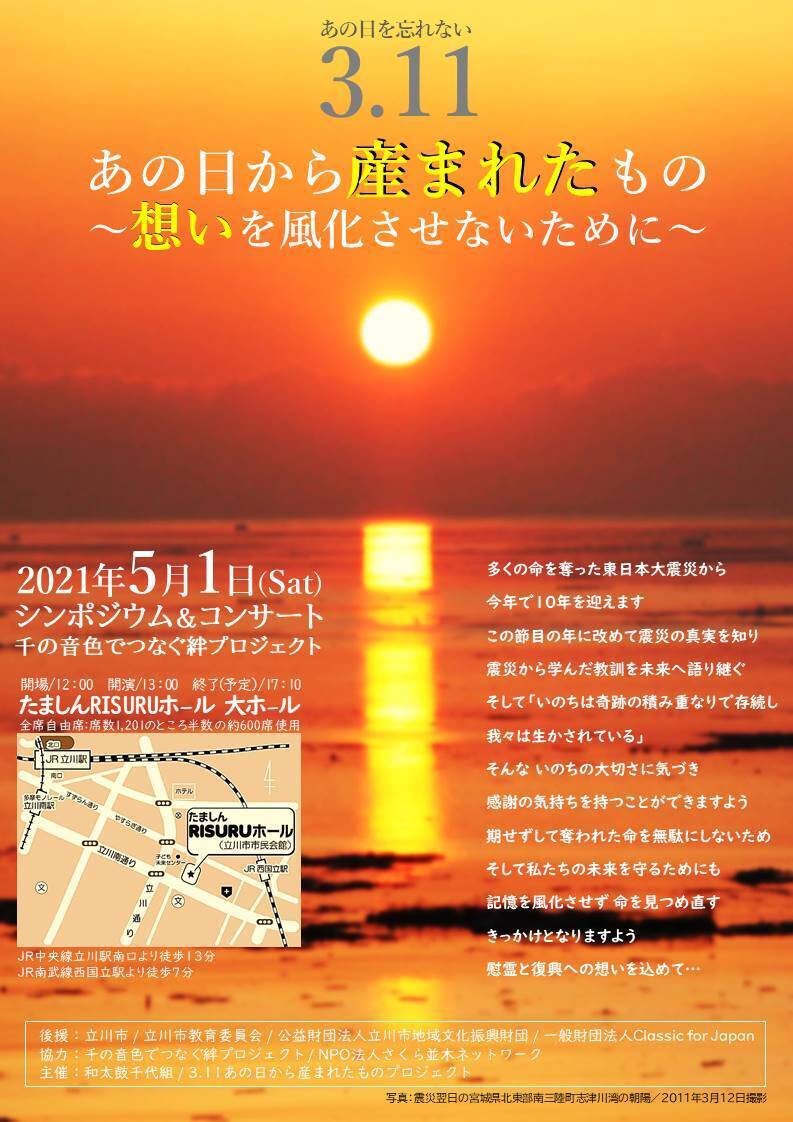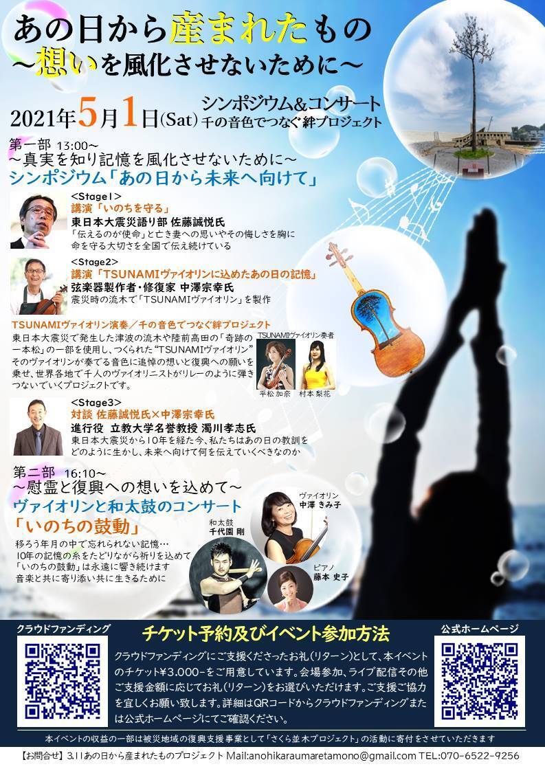 東日本大震災から10年が経ちました。あの日を思い出とは風化させない。そして、あの日から産まれたものもあるという想いで、二つの講演会と対談、TSUNAMIヴァイオリンの演奏、そしてヴァイオリンと和太鼓のコンサートを行う企画です。