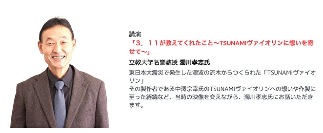 そのためには、この10年たった今に、改めて、当事者の第1人者である佐藤誠悦氏・TSUNAMIヴァイオリン製作者である中澤宗幸氏のそれぞれの講演及び対談を通じて、被災するということ、そして今の私たちの生活というものと照らし合わせて考える見つめ直す時間を共有したいということ