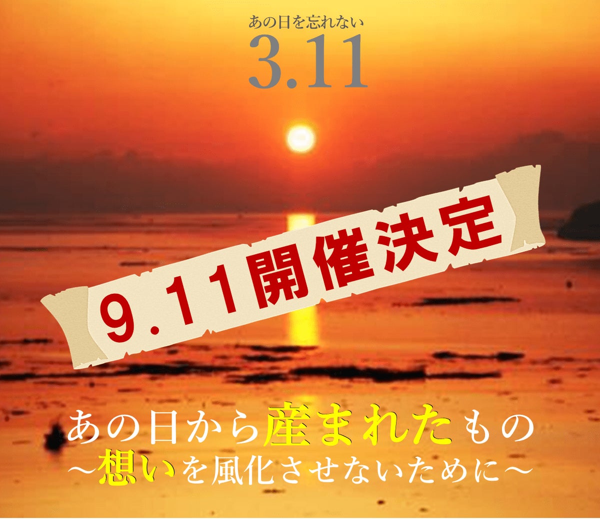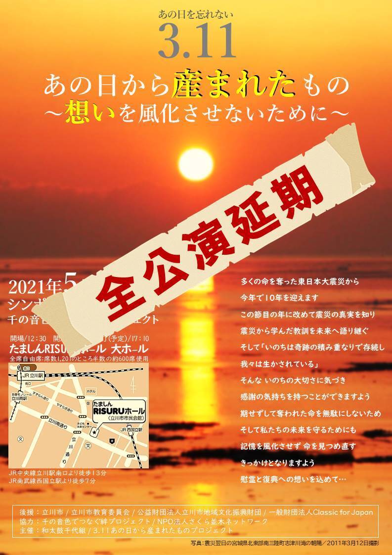 緊急事態宣言再発令により、5/1のイベント、3.11あの日から産まれたもの〜想いを風化させないために〜の開催が出来なくなり皆様にはご心配、ご迷惑をおかけしまして誠に申し訳ございませんでした。お待たせしておりました実施の日程が決まりました!■日にち 9/11(土)■場所 くにたち市民芸術小ホールhttps://kuzaidan.or.jp/hall/開始時間などが若干変更となる可能性があります。少し先にはなりますが、皆様どうぞ楽しみにお待ち下さい!活動報告にも同じお知らせを載せる関係で通知が2通いってしまう方もいると思います。ご了承ください。尚、払い戻しをご希望の方はこちらまでご連絡をお願い致します。◆払い戻しについてのご連絡先◆返金窓口担当/近藤<Mail>anohikaraumaretamono@gmail.com<TEL>070-6522-92563.11あの日から産まれたものプロジェクト 実行委員会