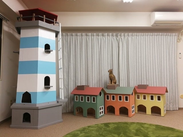 店内の様子 港町の横浜らしい灯台型のキャットタワーが人気。