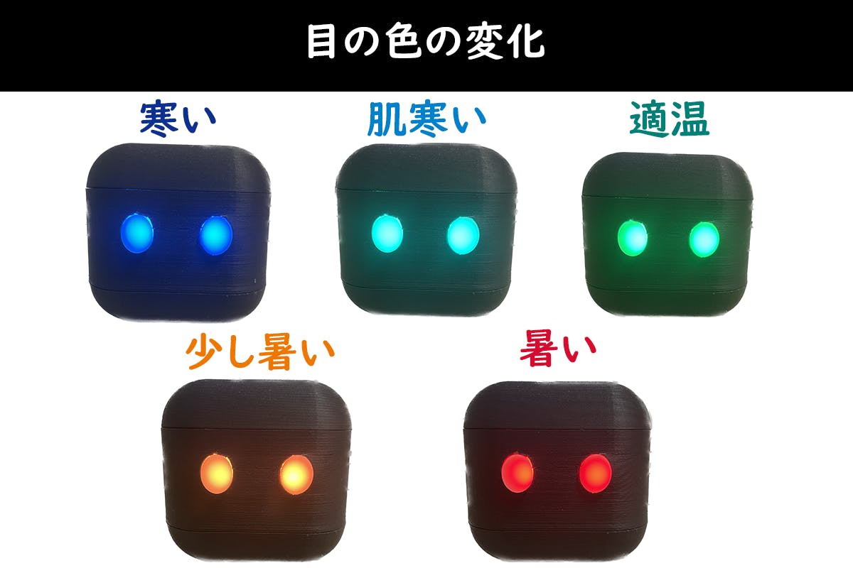部屋の温度と湿度を計測し不快指数を計算し、その値に応じて目の色が変化します。