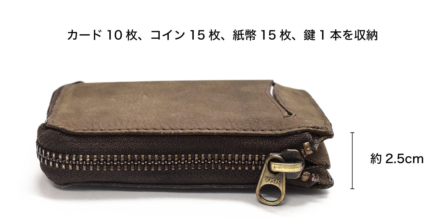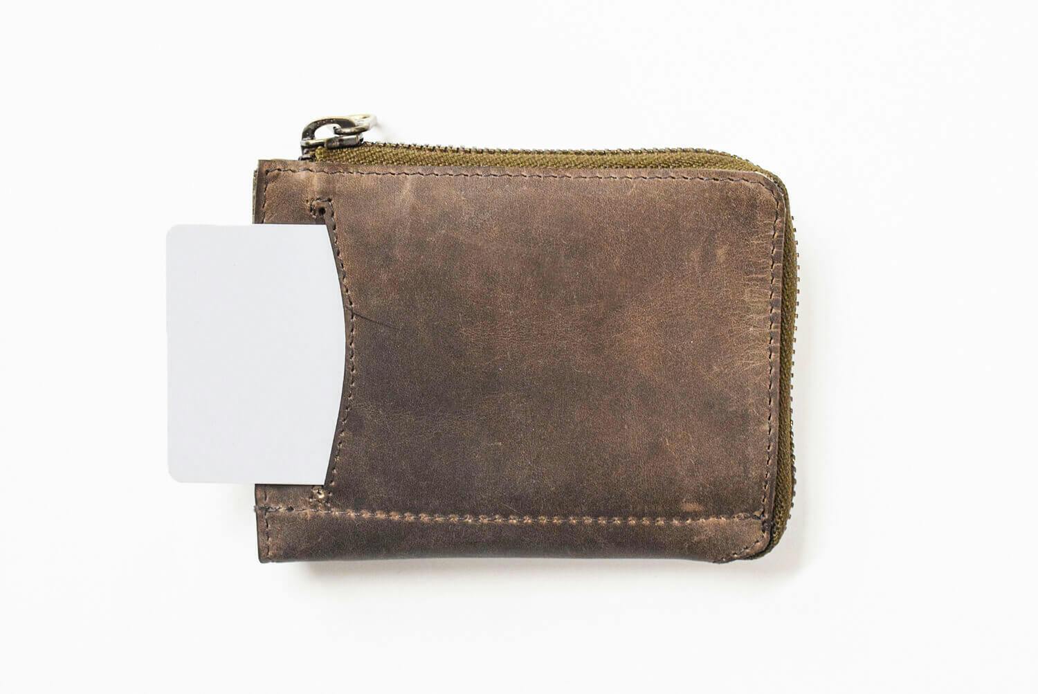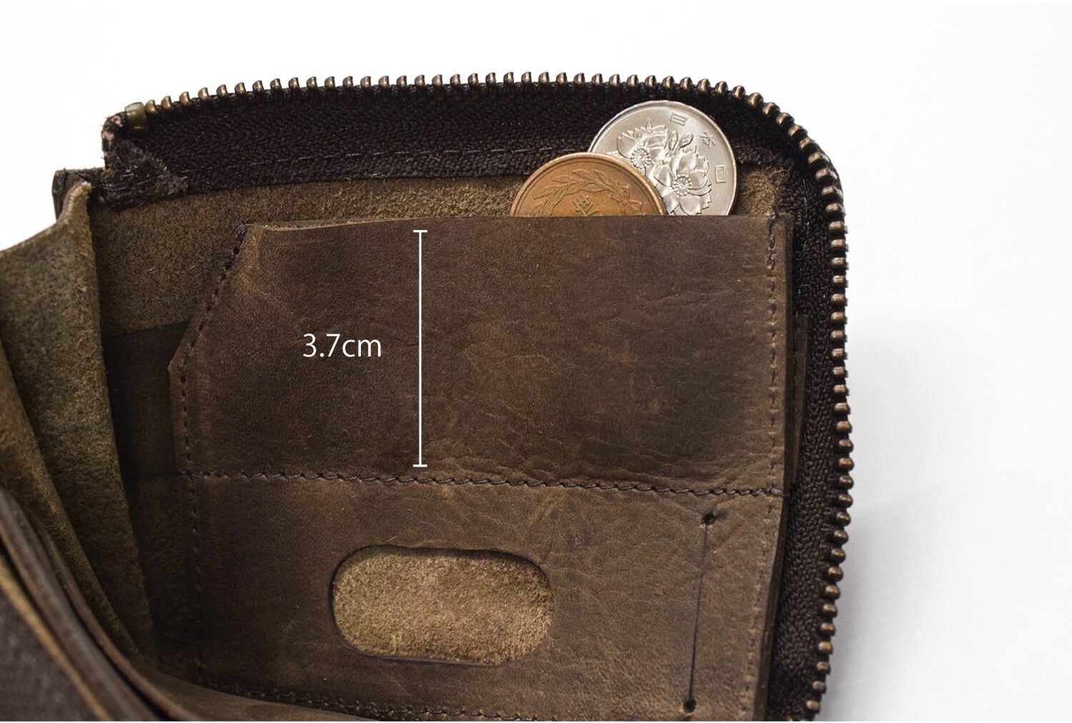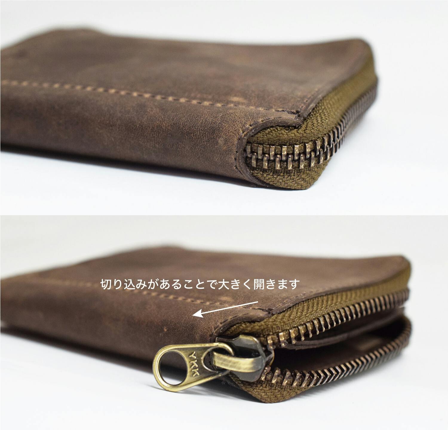 底にラウンド型に切り込みを1cm加えることで、小さい財布にありがちな窮屈さを解決しています。