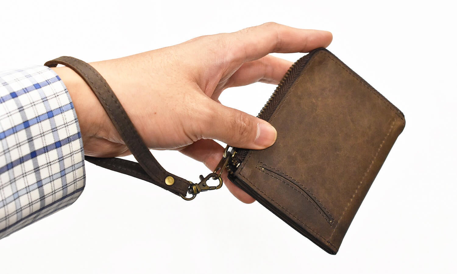 財布の引き手部分に金具を取り付けていただき、腕に通してお使いいただけます。