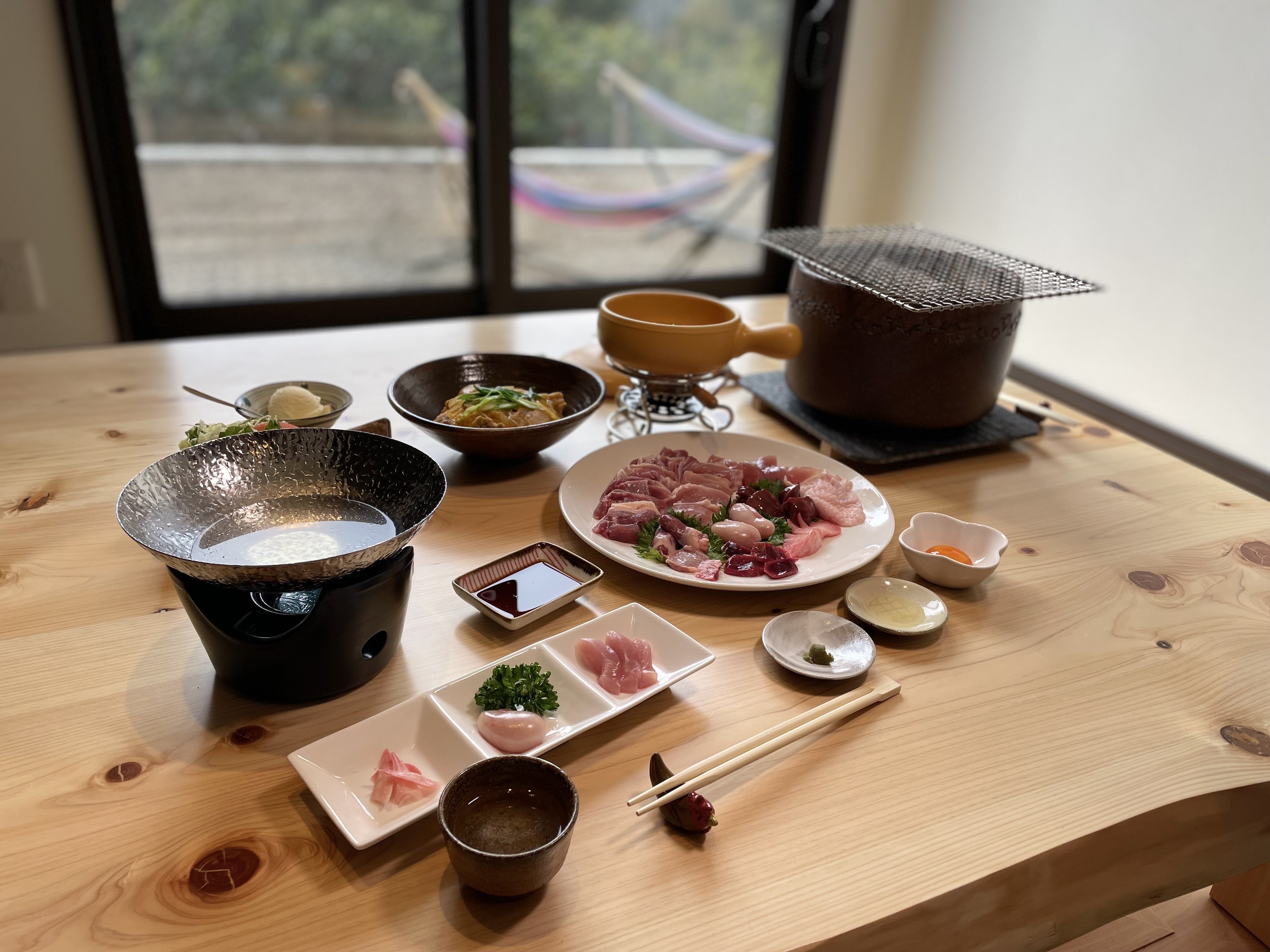 こんばんは。はたやま夢楽の小松圭子です。応援いただいたジローのおうちも来週オープンとなります。今日は、テレビ局さんが取材に来てくださり炭火焼きコースをご紹介させていただきました(^^)憩の家を卒業してから、この10か月、どんな料理が良いだろうと悩み続けた結果、こんな形になりました。 手前の器に、食前のジロースープ。お酒をたしなまれる方も多いのでほんの少しですが、ジローの滋味を口にしていただきたくスープを作りました。 2品目は、ジローのスープでしゃぶしゃぶ。ササミと、白子、鶏冠を、ジローのスープでしゃぶしゃぶにしていただきます。料理を考えている時に、お客さんから刺身がなくなって、炭火焼きで肝類を楽しめてはいるけれど最初にガツンと希少部位の味を知りたい、というリクエストをいただきました。 ジローはどの部位も味わいが濃いですが特におススメしたいササミと、白子、鶏冠を選びました。そのままでも良いですが、お醤油もご用意します。 3品目は、その日のお楽しみです。畑山ジローの店で、いろいろとオードブルで提供させていただいて好評でした。唐揚げやジローのロール巻き、昆布巻きなど食べていただきたいものを、3品目にお出ししたいと思っています。リクエストがあれば、ご予約時にご相談いただければお作りしたいと思います。 メーンの炭火焼きは、全10部位です。もも、むね、ささみ、皮、砂肝、レバー、ハツ、白子、鶏冠、ホルモン。最初の一通りは、私か靖一さんが焼かせていただきお皿にお持ちします。熱々を召し上がっていただけます。 天日塩で味付けしてありますが柚子酢、柚子胡椒、土佐ジローの漬け卵、アヒージョでも召し上がっていただけるようご用意しています。 小松家は、ジローの漬け卵にはまっています。おススメです。 そして、ごはんもの。ミニ親子丼か、だし茶漬けをご用意します。当日お伺いします。親子丼は、はたやま夢楽の看板メニューですがだし茶漬けも裏メニューで人気です。 ジローのスープだしで、お茶漬けに。柚子胡椒が、あうんです。 最後は、ジロー卵のアイスか珈琲をお出しします。 先日は、高知新聞社さんも取材に来ていただきました。今日の高知新聞さんのwebサイトにて紹介いただいています。https://www.kochinews.co.jp/article/detail/539812…web掲載に気づいていなくて、お客さんから教えてもらいました。いつも、気にかけていただいて、ありがとうございます<(_ _)>明日の紙面に掲載されるでしょうか。楽しみです。旅行会社さんからも問い合わせをいただいたりしています。オープン前なのに、有難いことです<(_ _)> そんなテレビ取材の朝。靖一さんは、ユンボで前庭をガタゴト整地していました。オープンに間に合うのか…不安もありますが(;'∀') 取材に来てもらう時間ギリギリまで、地面をならしてました(^^;)これから砕石を敷いてもらう予定です。今日は取材ということもありましたが私自身、イメージがなかなかできてないのでとりあえず、並べたいものを並べてみました。 玄関前には、パラソルを。前庭には、ハンモックを。前々から持っているものではありますがまた、皆さんに活用いただける日がきました! 砕石を敷いてもらう予定ではいますが夏場には、テントも張りたいと思っていてどういう仕上げにするか、いまだ思案中です(;''∀'')のぼりの後ろに見えている木造の小屋っぽいのは自転車置き場の予定です。 おいおい自転車も用意したいと思っていてこの小屋の色塗りも、皆でできればなぁとまだ塗っていないのです… お花もいただいたりしていまして華やいでいます♪ 畑山ジローの店のオープン時にいただいた観葉植物たちもジローのおうちへ引っ越してきています。 コロナ禍という大変な時期にオープンとなり不安もあり、日々、準備などに追われて視野が狭く、うつうつと、いらいらとしがちですが先日来、取材も受けながら、これまでを振り返る時間にもなりました。改めてオープンまでたどり着けたことまだオープン前なのに、ご予約をいただけていること開店の御祝にとお花を送っていただいたり鶏グッズを送っていただいたりしていることどれをとっても、有難く、恵まれているなぁと温かい気持ちになれました。 畑山で宿がなくなり、コロナ禍もあり、人と話す時間も減り、ジローを語る時間も極端に減った10か月でした。 人と話すことの大切さ、畑山で迎えられることの有難さを痛感する日々です。 畑山でお待ちしています<(_ _)>