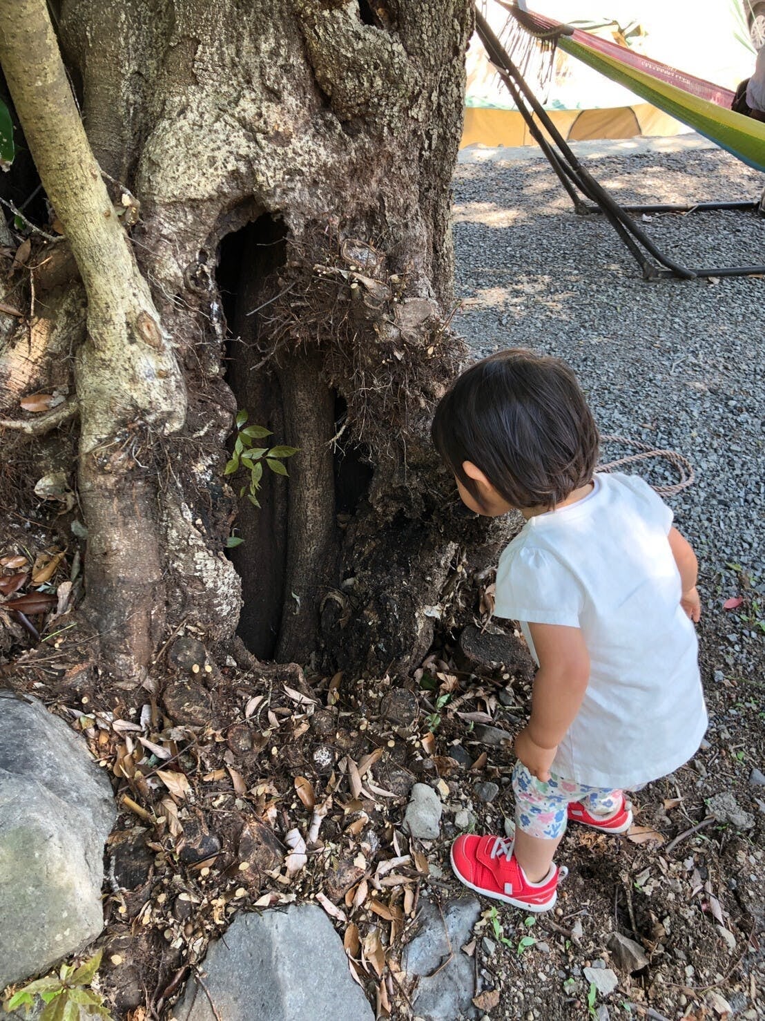 おうちの入り口にある木の根っこに穴があるのを見つけて