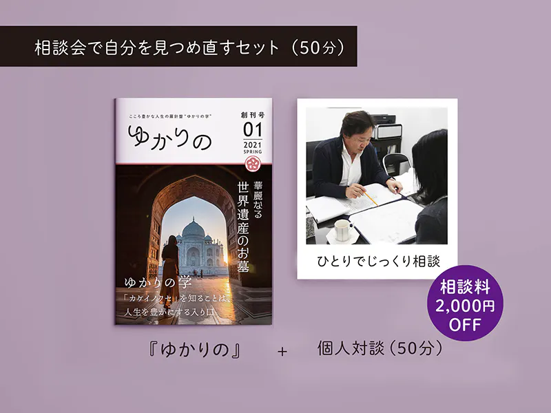 『ゆかりの』に個人相談をプラスした、実際にお話しをする特別セットです。個人での対談が基本となります。(通常相談料が50分14,000円となっていますので、2,000円プラス送料140円がOFFになっています)