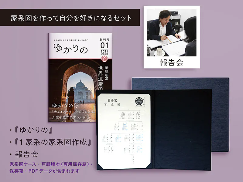 『ゆかりの』と、自宅でしっかり保管できる家系図をつけたスペシャルセットとなります。[家系図ケース・戸籍謄本(専用保存箱)・保存箱・PDFデータが含まれます]