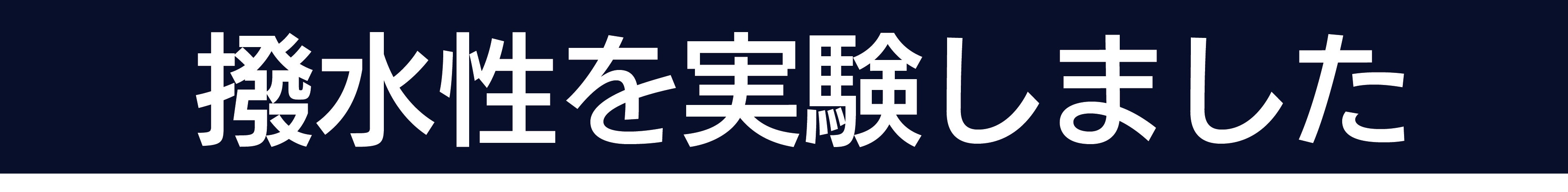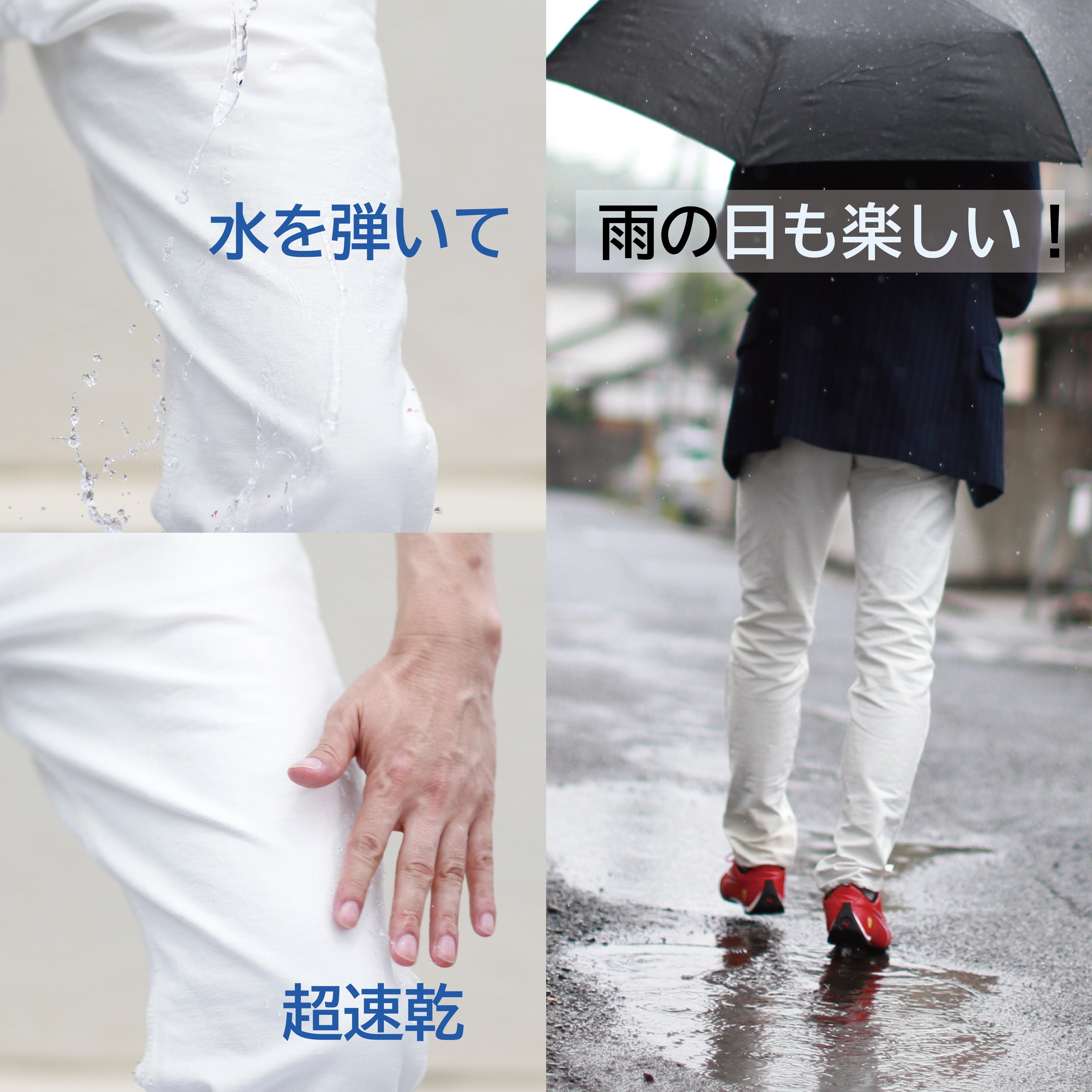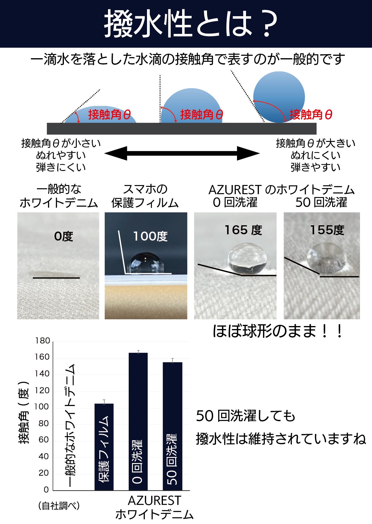 AZURESTのホワイトデニムは撥水加工用の溶液1.5倍濃度で処理しています。このため、高い撥水性が得られているのです。