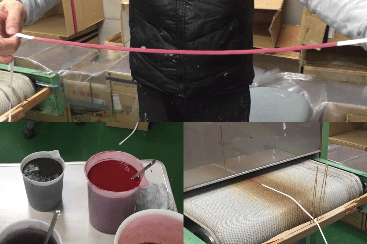 福井県にある染色工場にて職人が1本1本手染めで生産しています。