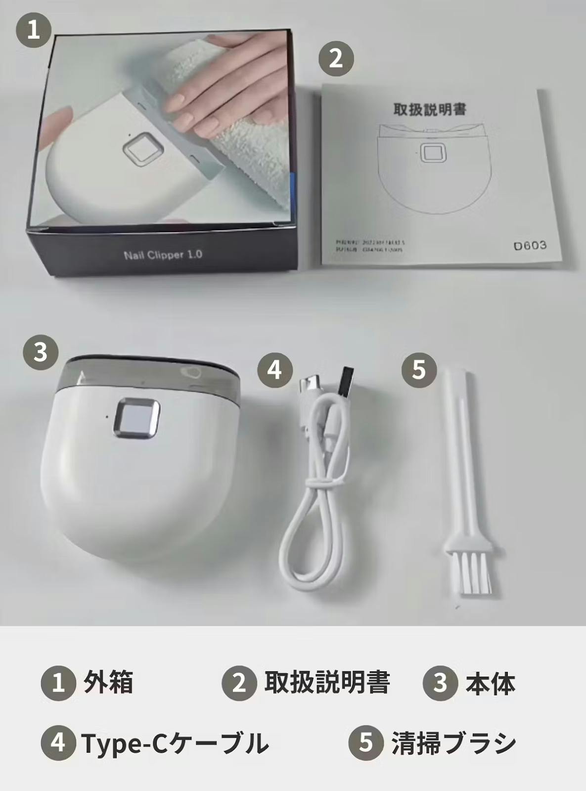 ワンタッチで爪削り、刃物不要で負担なし!削りカスケース内蔵で飛び散らず、簡単に捨てられる。お掃除ブラシ付きで清潔、300mAhバッテリーで長持ち。LEDライト付きで暗所でも安心!