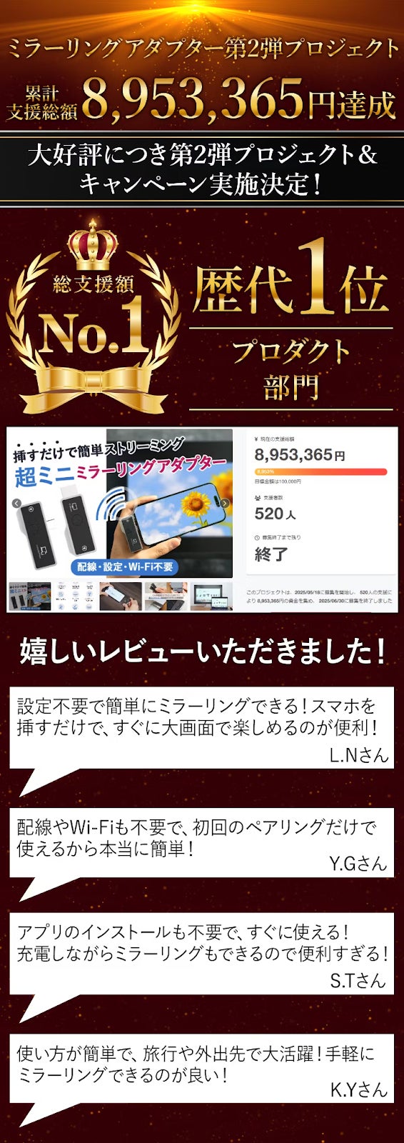 今回は皆さまに「スマホやデバイスに挿すだけで簡単ミラーリング!初回ペアリングのみでOK。面倒な設定やアプリ不要。充電しながらのミラーリングも可能」プロジェクトを紹介させて頂きます。