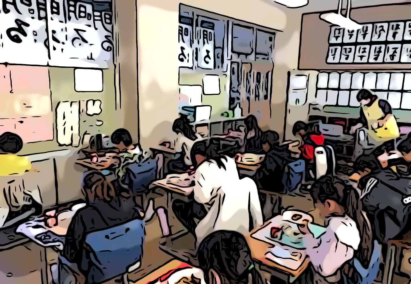 給食も机をつなげて食べられず、机を一人一人離して、黒板に向かって食事をしています。