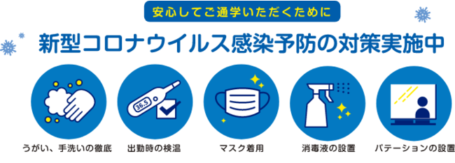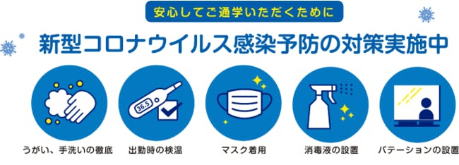 当スクールでは、新型コロナウイルス感染症対策ガイドラインに沿ってコロナ対策を実施しております。