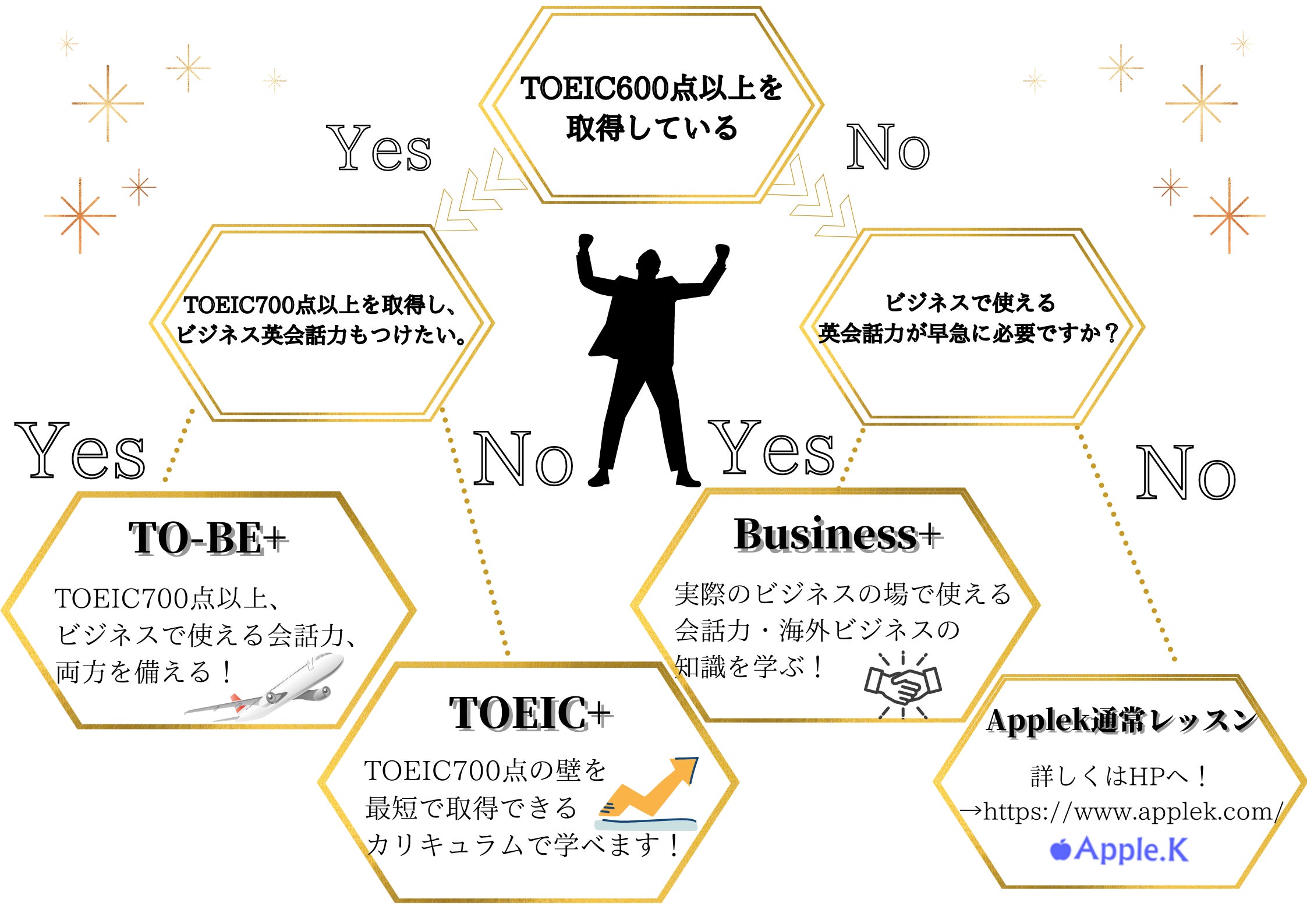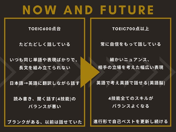 そのような方々に本当の英会話力をつけていただきたいという願いから、TOEIC®700点以上の取得を目指す『TOEIC🄬+(plus)』コース、海外ビジネスの場でも使える英会話力を身につける『Business+(plus)』コースを開講、その両方を身につける『TO-BE+(plus)』コース を提供し、英語を使用したスキルUPのサポートを全力で応援・サポートするコース作りたいと思い、この度のコースが誕生いたしました。