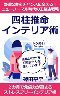 電子書籍&お礼のメールのリターンでご用意する電子書籍は、今年の1/13に発売したばかりの『四柱推命インテリア術: 面倒な客をチャンスに変える!ニューノーマル時代の工務店戦略』です。四柱推命の要素である陰陽五行を分析することで、その部屋にあったインテリアの色柄を特定するテクニックを公開しています。ストレスフリーの家づくり設計に今こそ求められる技術です。住関連のお仕事に携わる方にぜひ読んでいただければと思います。
