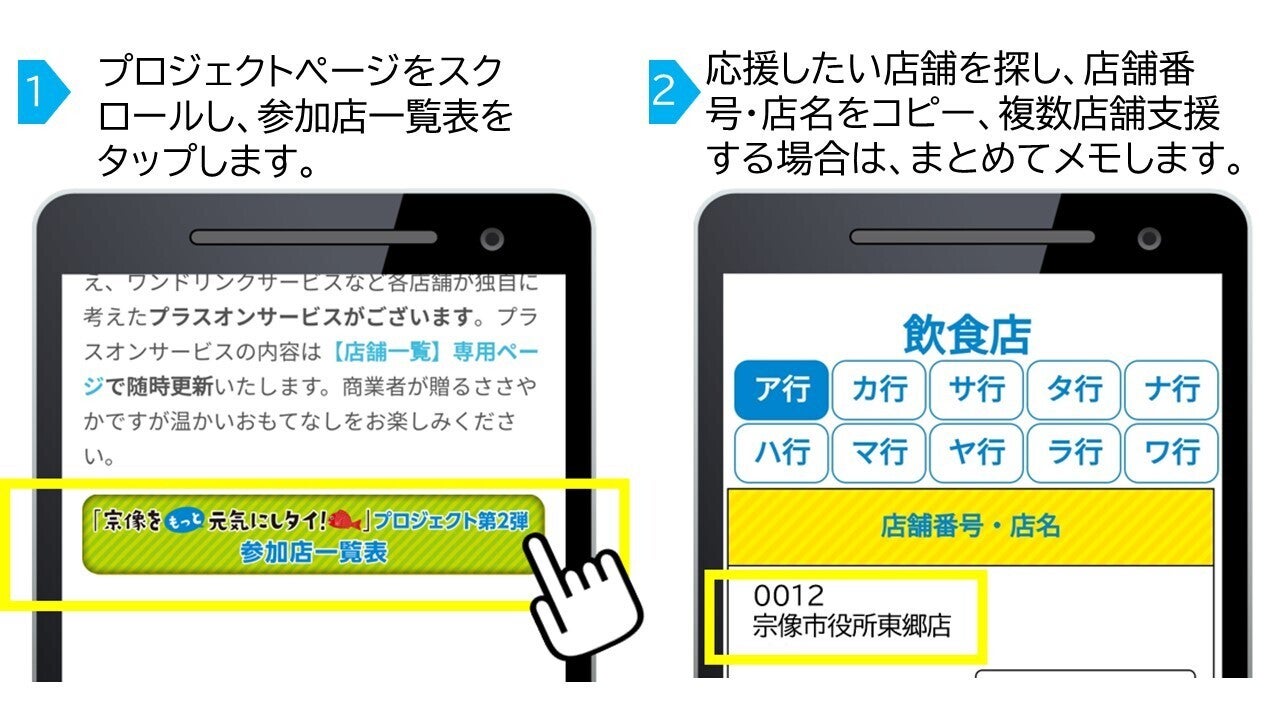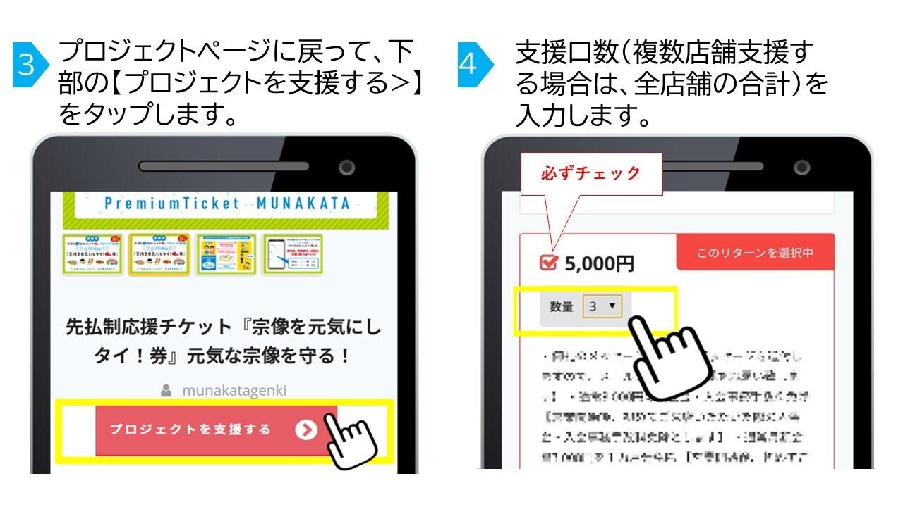 このプロジェクトでは、これまで顧客としてお店を支えられていた皆様に再度「支援者」となっていただき、先払い制の応援チケット「宗像をもっと元気にしタイ!券 」を通じ、事業者を応援するため、広く皆さまのご支援を募らせていただきます。