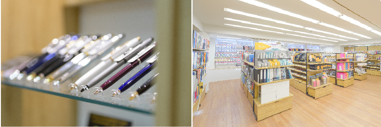 改装前の雑然とした店内ホームセンターのように雑然としていた店内を内装は数寄屋造風の落ち着いた雰囲気にして2階は従来のビジネスマン向けの事務用品、1階は「手書きを楽しむための文具」として万年筆、ボールペン、ガラスペン、シャープペン、鉛筆、インク、便箋などをラインナップしました。また、オリジナルガラスペン・インクの企画販売や、100種類以上のインクを実際にお試しできるスペースを設置するなど「手書きが楽しくなる文具たちと出会える場所づくり」を心掛けました。