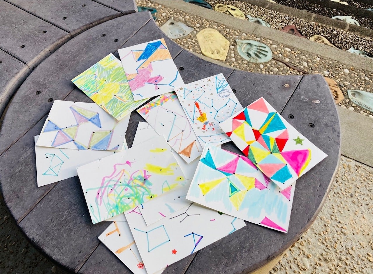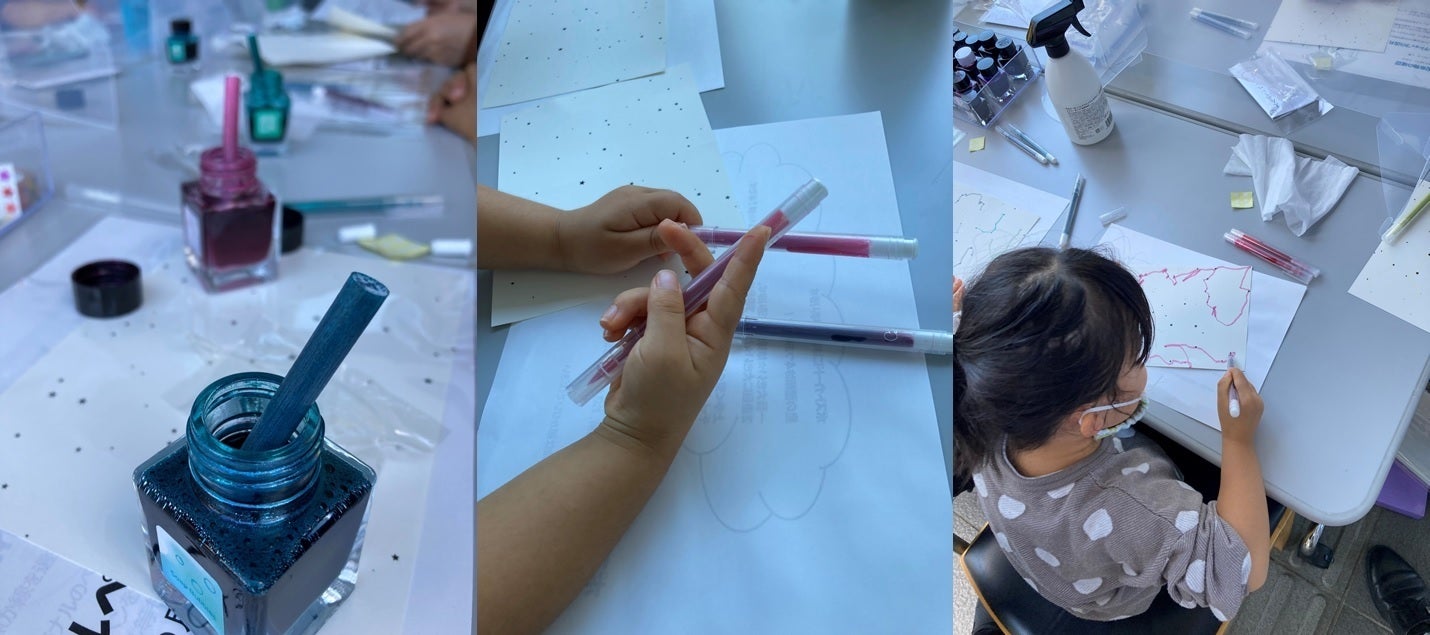 コロナになり、さまざまな体験が制限されてきた2年。特に子供達は、さまざまな学校行事の延期や中止を余儀なくされました。子供は、さまざまな体験を通じて学び、豊かに成長します。だから、インクを吸い上げてあえてすぐに書けないもどかしさや、色の変化を楽しむ事を体験し、自分の思いのままに、線を引き、色を塗り想像力を膨らませる体験をしてほしい!!との想いで企画したワークショップです。大人向けとして、秋の星座がかくれているというSMDならではの遊び。大人も子供も個性豊かな作品になりました!!