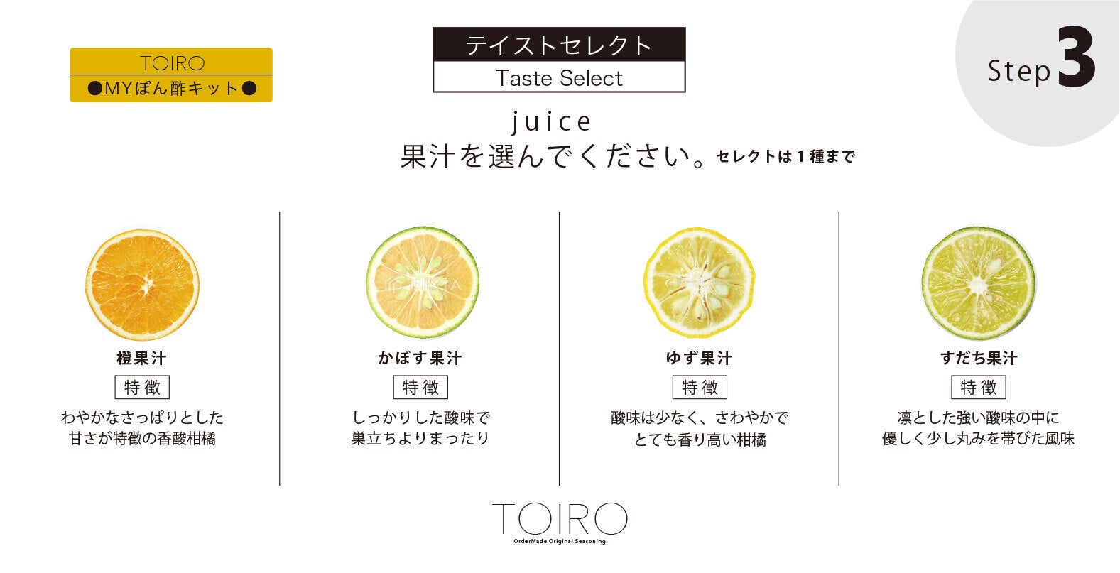 Step.3:柑橘果汁を選びます。(MYぽん酢キット)