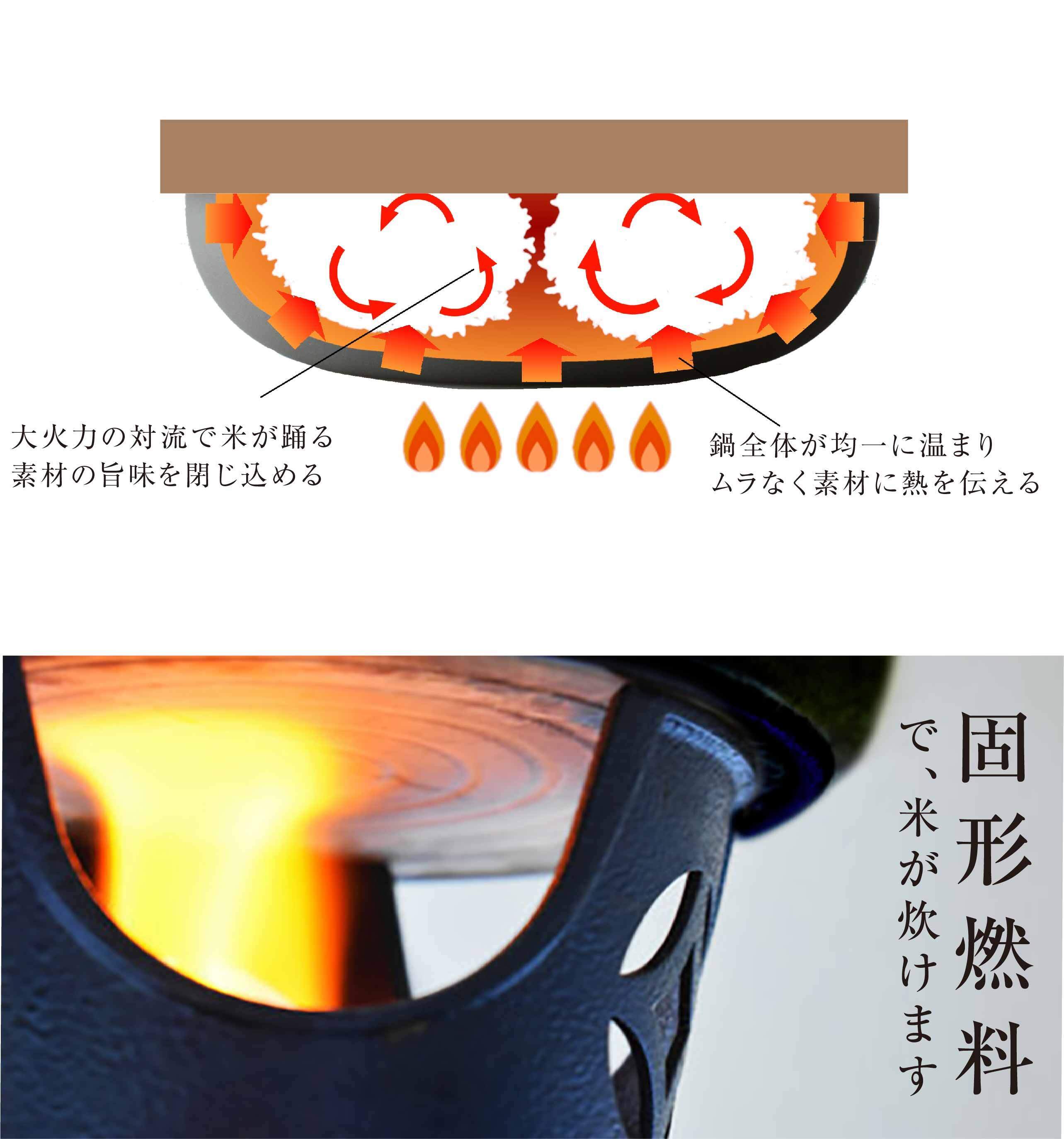その圧倒的な熱伝導率により、固形燃料の少ない火力と時間でもお米が炊けます。