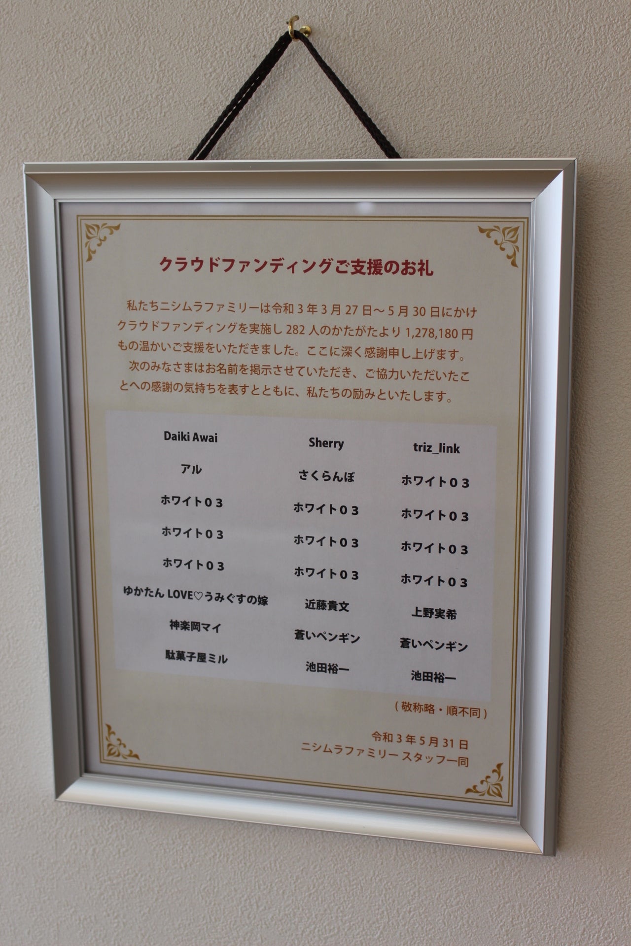 また、千歳店舗内において「お名前を掲示させていただくコース」にご支援をいただきました皆様の掲示も開始させて頂いております。