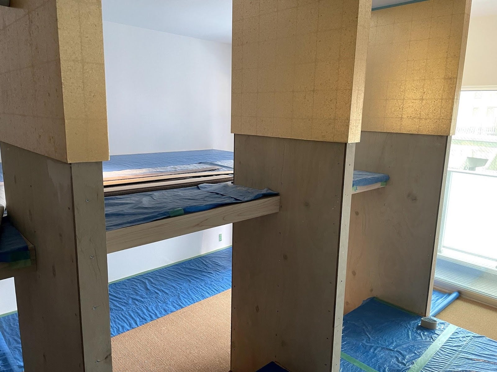 このお部屋は高さの異なる3段の床が特徴です。膝上の高さにある小上がりとなる床と目線の高さにある上の床と、その床の下にある床。みなさんはどこでどのように過ごすでしょうか。居場所がイメージしづらいかもしれませんが、でもどこにいても落ち着けそうな。そんな部屋が完成するのももうすぐです。「金」から連想された部材で続々と仕上げが進んでいます。