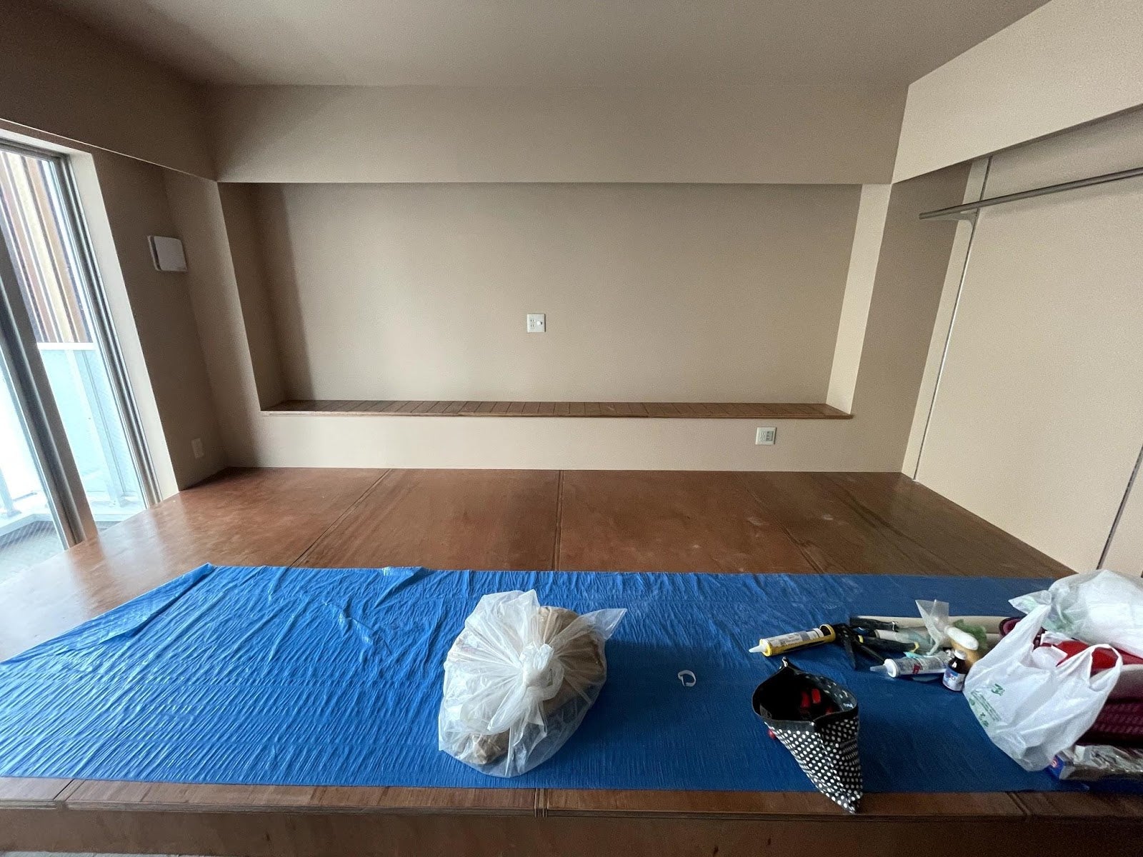 セブンストーリーズは名古屋の都心にあるのに「コテージ」と不思議ですが、木材をふんだんに使ったまさにコテージのようなお部屋です。今は、壁と小上がりの工事が完了しています。刈谷市に本社を構える有名な家具メーカー「カリモク」の家具が入ると、さらに過ごしやすい雰囲気になるのかもしれません。なんで木肌ってこんなに人の心を落ち着かせてくれるんでしょうか。はやく宿泊された方の感想を聞いてみたいです。